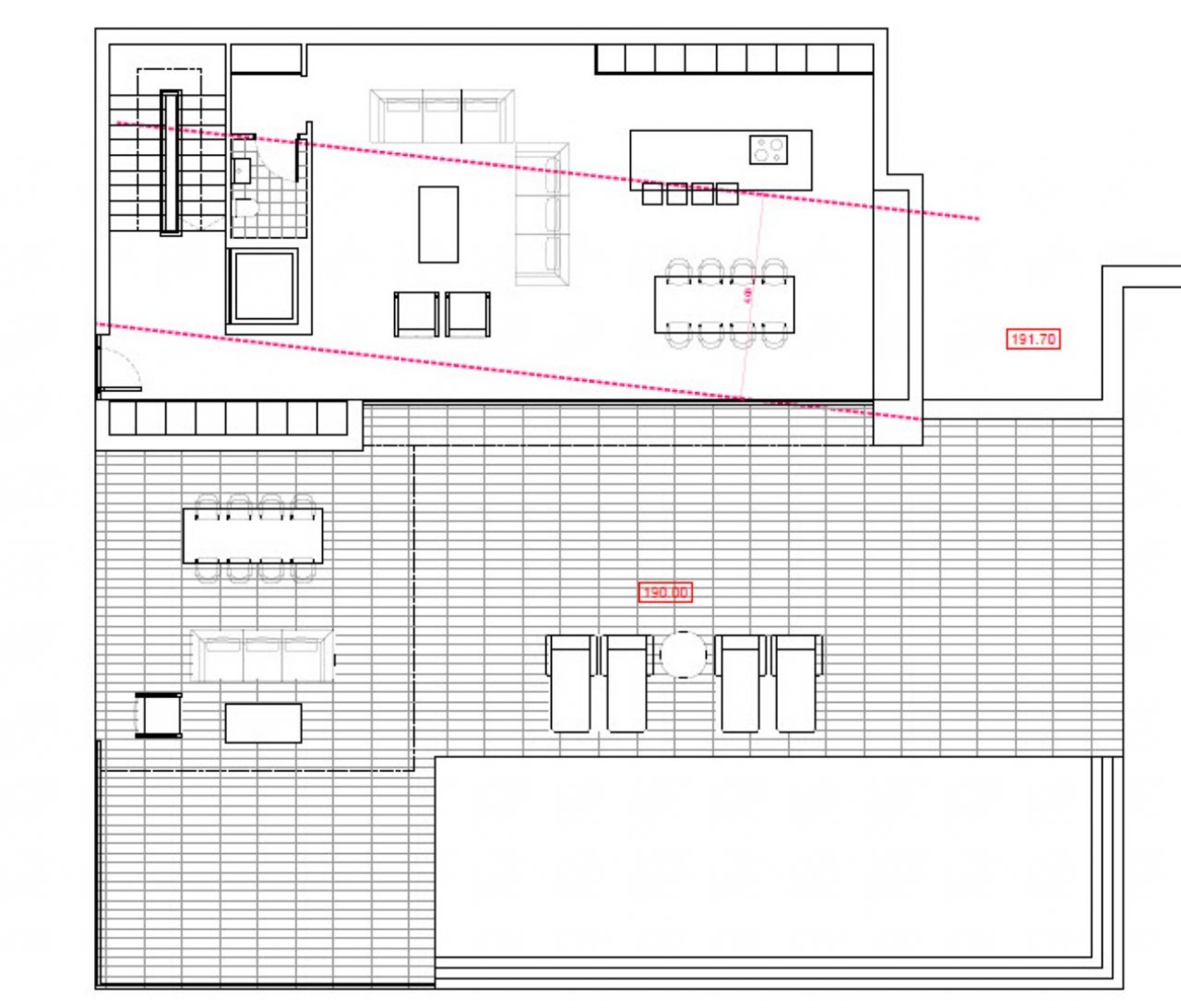Dieses Projekt verfügt über eine Baugenehmigung, der Bau kann sofort nach Unterzeichnung des Bauvertrags beginnen. Moderne Neubauvilla mit Meerblick in Benissa zu verkaufen. Diese sehr große Luxusvilla besteht aus 4 Etagen, die durch einen Aufzug, eine Innentreppe und eine Außentreppe verbunden sind. Im Erdgeschoss gibt es eine Eingangshalle mit einer Gästetoilette und ein sehr geräumiges Wohnzimmer mit einer offenen Küche. Durch große Schiebefenster gelangen Sie nach draußen, wo Sie von der überdachten Terrasse, vom Infinity-Pool und von der Sonnenterrasse aus einen spektakulären Blick auf das Meer haben.