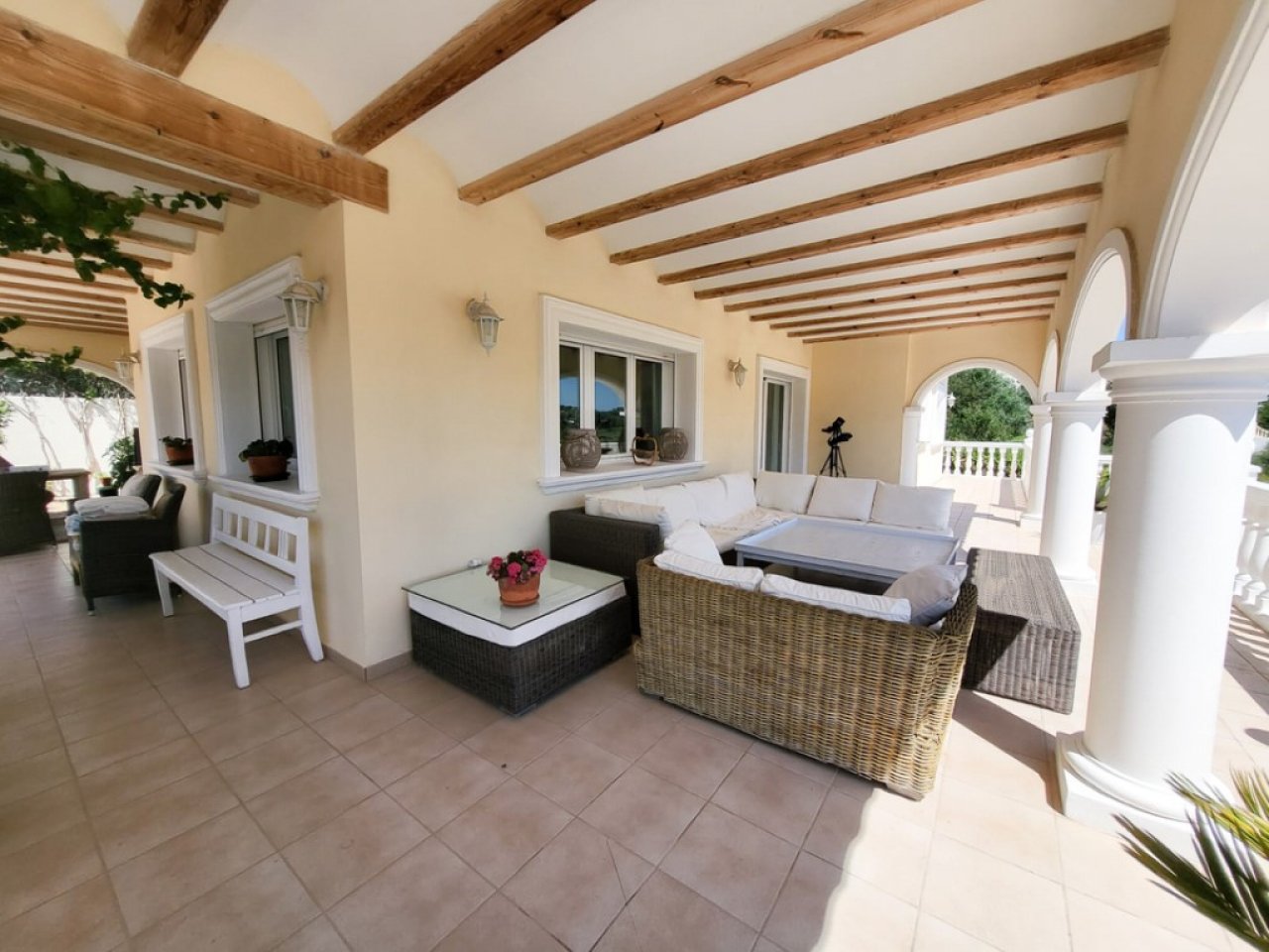 Diese traditionelle spanische Villa liegt weniger als 3 Kilometer vom Zentrum und dem Hauptstrand von Moraira entfernt und kann wegen der fast flachen Straßen zu Fuß erreicht werden. Die Villa erstreckt sich über 3 Etagen. Auf dem allgemeinen Wohnbereich gibt es ein geräumiges Wohnzimmer mit Essbereich, eine voll ausgestattete moderne Küche, 2 Schlafzimmer mit Doppelbett und ein Badezimmer. Sowohl das Wohnzimmer als auch die Küche bieten Zugang zur geräumigen überdachten Terrasse. Darüber hinaus gibt es einen Grillplatz auf der anderen Seite des Hauses. Auf der obersten Etage befindet sich das Hauptschlafzimmer mit Bad en suite, das auch Zugang zu einem großen privaten Balkon hat. Im Erdgeschoss befindet sich ein zweites Wohnzimmer mit einem Doppelzimmer mit Bad en suite, wodurch es sich hervorragend als Gästehaus eignet. Die Terrasse mit Pool befindet sich ebenfalls im ersten Stock und bietet viel Privatsphäre.