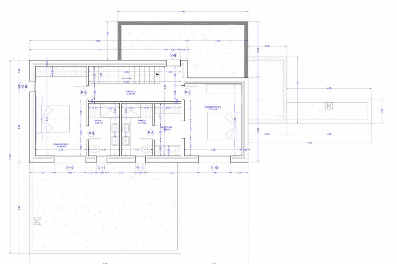 Über die Treppe gelangt man in das Obergeschoss, wo man von einem eleganten Flur empfangen wird, der zu zwei großzügigen Doppelschlafzimmern führt, beide mit eigenem Bad. Eines von ihnen verfügt außerdem über ein praktisches Ankleidezimmer, das dem Ganzen Komfort und Funktionalität verleiht.