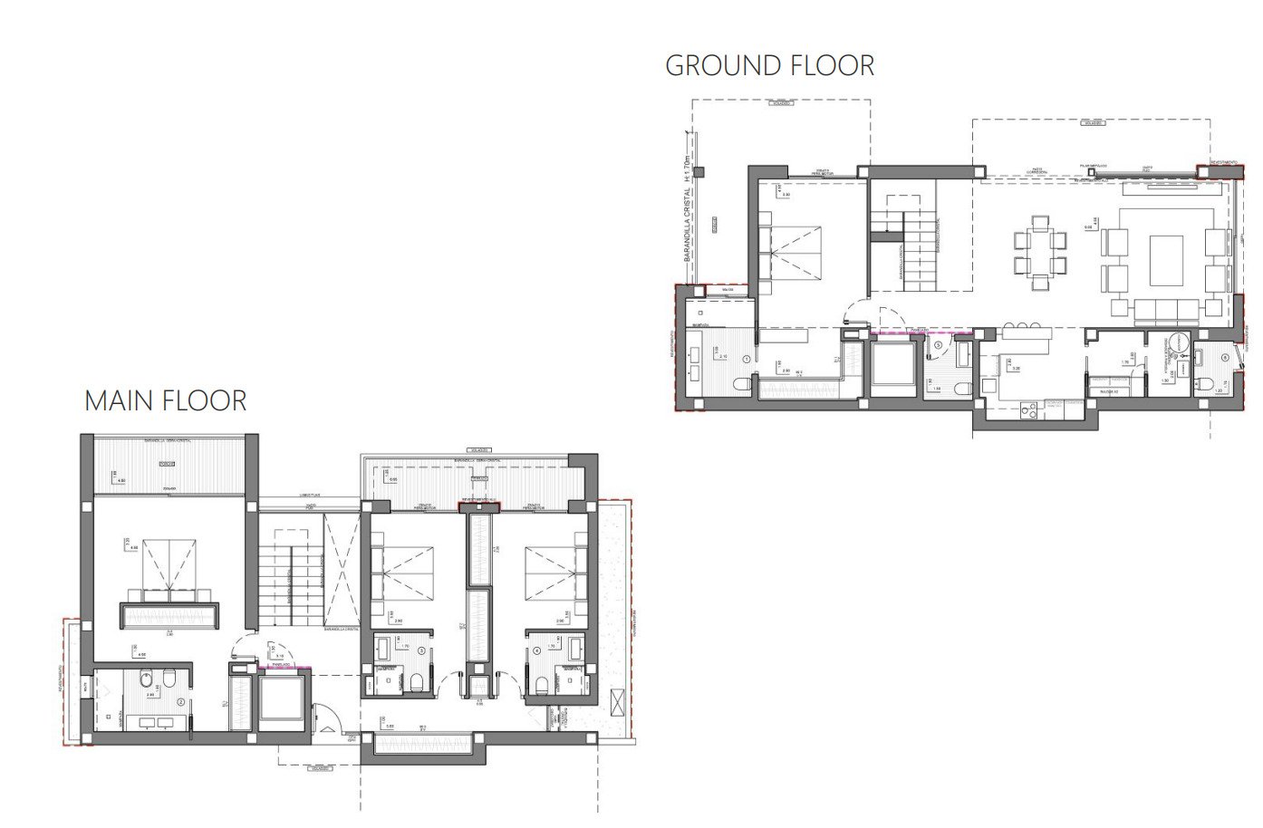 Das Erdgeschoss ist in zwei Bereiche unterteilt, die durch den Flur und die Treppe getrennt sind. Auf der einen Seite befindet sich das vierte Schlafzimmer mit eigenem Bad, Ankleidebereich und Zugang zur Hauptterrasse mit Veranda. Der andere Bereich umfasst eine Gästetoilette, eine offene Küche, die mit dem Esszimmer verbunden ist, mit einer zentralen Kochinsel und einer Frühstücksecke, sowie ein helles Wohnzimmer mit Zugang zur Veranda. Im Außenbereich befinden sich eine große Terrasse und ein Infinity-Pool, von dem aus Sie die schöne Aussicht genießen können.