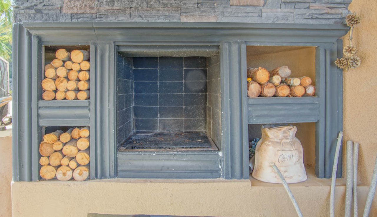Auf der gleichen Ebene befinden sich der Swimmingpool mit herrlichem Meerblick, die Gärten, mehrere schattige Sitzecken und ein Grillplatz mit Kamin.…