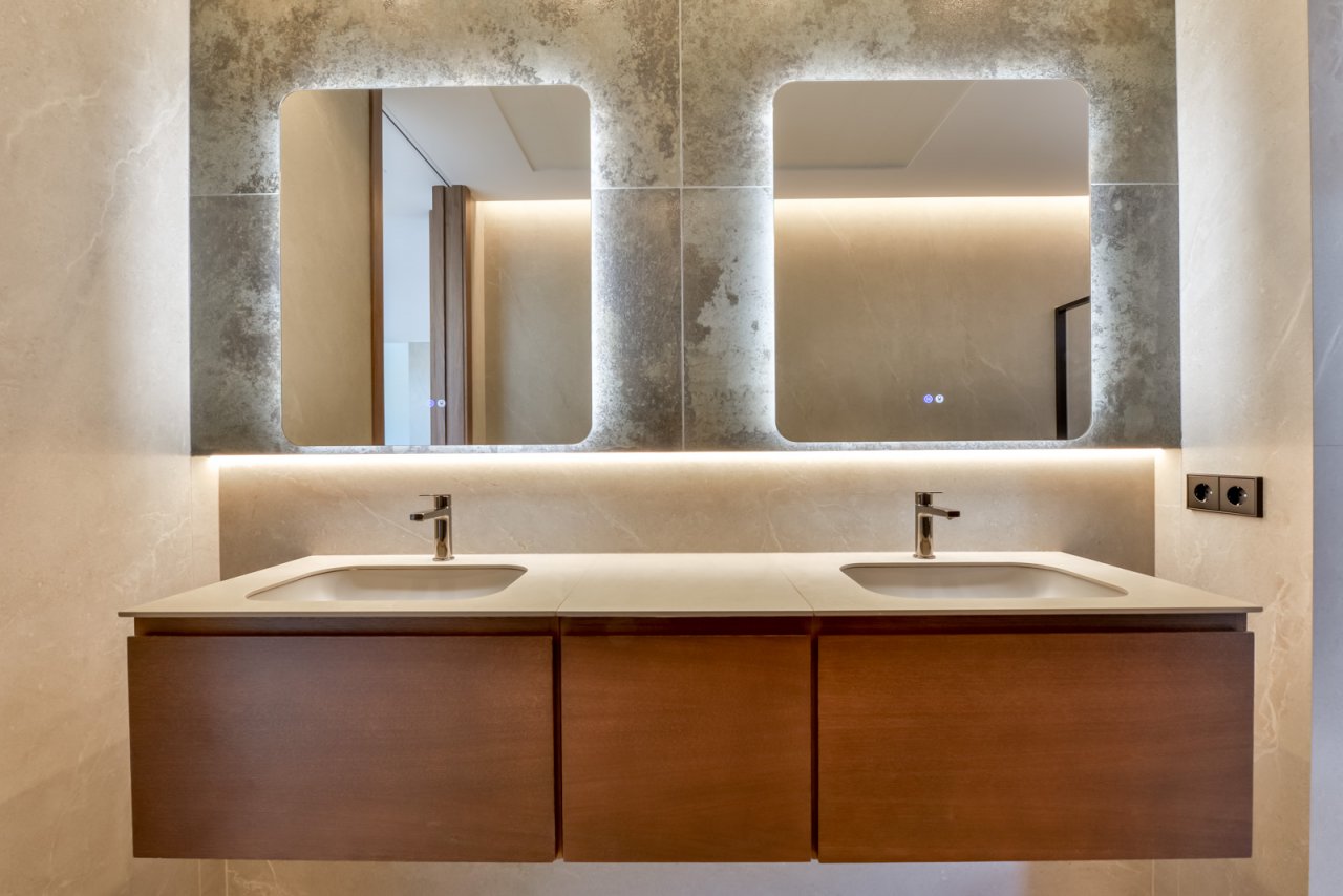Außerdem gibt es auf dieser Etage ein sehr geräumiges Schlafzimmer mit Doppelbett und einem eigenen Bad sowie ein Gäste-WC. Sowohl vom Schlafzimmer als auch vom Wohnzimmer aus hat man durch Schiebefenster direkten Zugang zur Terrasse am Pool. Das Obergeschoss besteht aus drei Doppelschlafzimmern, jedes mit eigenem Bad und mit Zugang zu einer überdachten Terrasse. Im Untergeschoss befinden sich eine Garage mit Platz für zwei Autos, eine Waschküche, zwei Technikräume und ein Mehrzweckraum. Die Villa hat sowohl eine Sonnenterrasse als auch eine überdachte Terrasse am Pool und wird von einem schönen mediterranen Garten mit automatischer Bewässerung umgeben sein. Der Pool ist mit einer Beleuchtung ausgestattet und es gibt ein Außenbad.
