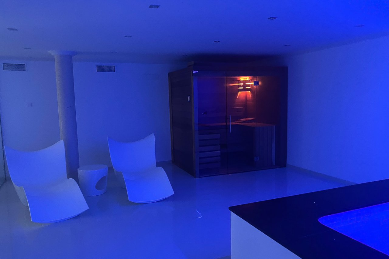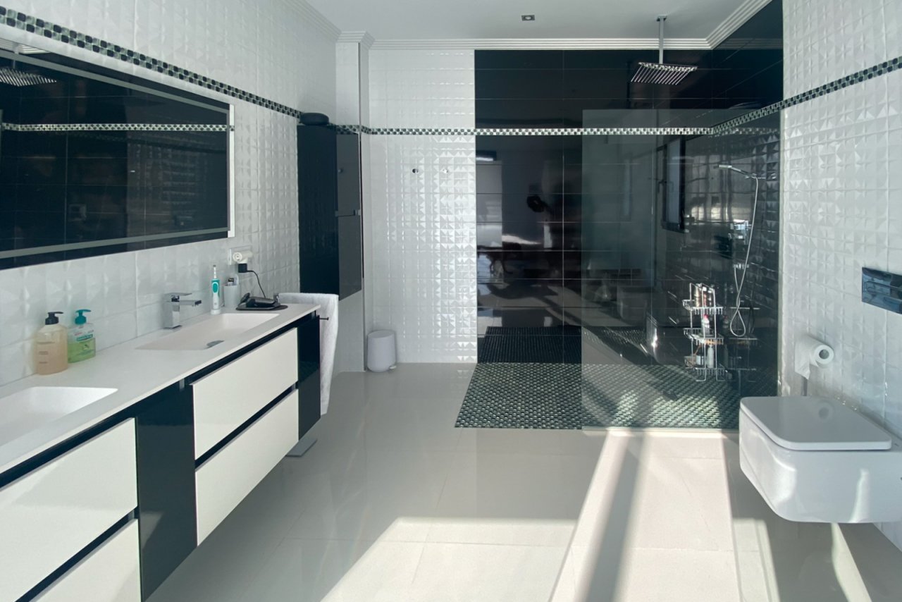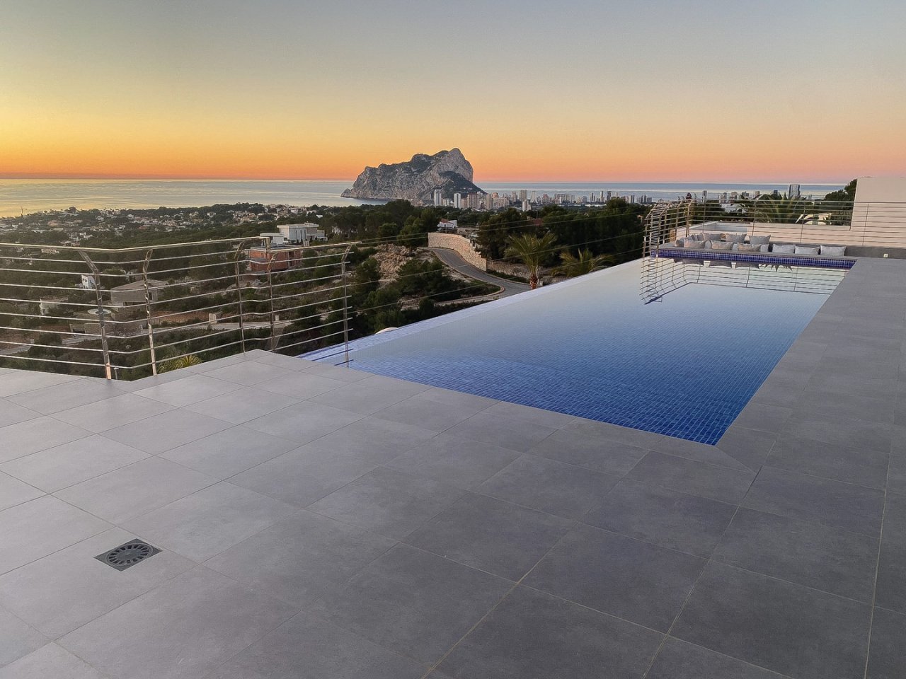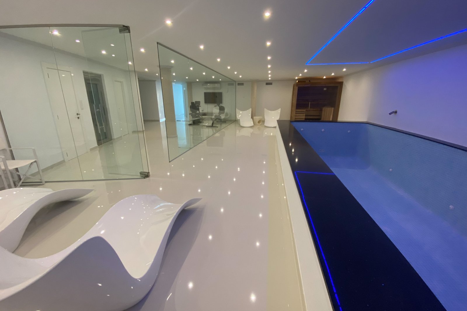 In der prestigeträchtigen Wohngegend Raco de Galeno, nur 1.500 Meter vom Mittelmeer entfernt, steht diese außergewöhnliche Villa, die alles bietet, was Sie sich wünschen können. Mit spektakulärem Meerblick, dem ikonischen Peñón de Ifach und einem unvergleichlichen Design ist dies die Immobilie für diejenigen, die ultimativen Luxus und Komfort suchen. Die Villa erstreckt sich über 3 Etagen, die durch einen Aufzug verbunden sind, auf einem großzügigen Grundstück von 1.800 m². Mit einer bebauten Gesamtfläche von nicht weniger als 770 m² bietet diese Immobilie viel Platz für Entspannung, Unterhaltung und Privatsphäre. Dank des cleveren Grundrisses ist das Anwesen sowohl von oben als auch von unten zugänglich. Oben gibt es einen Parkplatz für drei Fahrzeuge und einen direkten Zugang über einen Aufzug oder eine Treppe zu den unteren Etagen. Im unteren Teil des Grundstücks finden Sie weitere Parkplätze auf verschiedenen Ebenen, so dass Sie auch auf der Ebene des Erdgeschosses parken können. Außerdem gibt es einen Parkplatz für zwei Autos unter einem Vordach. Das Erdgeschoss ist das Herzstück der Villa. Hier finden Sie ein großzügiges Wohnzimmer mit Essbereich und eine moderne, voll ausgestattete offene Küche mit Bar und gekühltem Weinkeller. Die doppelte Decke und die hohen Fenster schaffen ein beeindruckendes Gefühl von Licht und Raum. Für zusätzlichen Komfort stehen eine Waschküche und ein Gäste-WC zur Verfügung. Auf der Ostseite befindet sich eine große Sommerküche, perfekt für das Kochen im Freien und gemütliche Abendessen. Vor dem Wohnzimmer erstreckt sich ein großzügiger Außenbereich mit einem luxuriösen Pool und einer bioklimatischen Pergola, unter der Sie mit bis zu 12 Personen speisen können. Ein eingebauter Sitzbereich neben dem Pool bietet Schutz vor dem Wind und einen unschlagbaren Meerblick. Im Obergeschoss befinden sich drei geräumige Schlafzimmer, jedes mit eigenem Bad en suite. Eines der Zimmer hat eine eigene Terrasse und von allen Zimmern aus genießen Sie einen atemberaubenden Panoramablick auf das Meer. Das Untergeschoss ist ganz dem Wellness und der Entspannung gewidmet. Hier finden Sie einen luxuriösen Fitnessraum, einen großen Innenpool mit Liegebereich, eine Zedernsauna und ein viertes Schlafzimmer mit eigenem Bad und Meerblick. Dieses Schlafzimmer ist sowohl vom Haus als auch vom Garten aus zugänglich, so dass es sich ideal als Gästeunterkunft eignet. Im unteren Teil des Grundstücks befindet sich ein charmantes Gästehaus von 20 m², das für das Personal oder als zusätzliches Gästezimmer genutzt werden kann. Vor dem Cottage befindet sich ein Boccia-Platz, der auf Wunsch in einen Paddle-Platz umgewandelt werden kann. Dank der Süd-Ost-Ausrichtung können Sie auf den verschiedenen Terrassen rund um die Villa den ganzen Tag die Sonne genießen. Raco de Galeno ist eine exklusive Urbanisation, die in den Hügeln von Benissa Costa liegt. In nur wenigen Minuten sind Sie an der wunderschönen Küste von Benissa, die für ihre idyllischen Strände und ihr kristallklares Wasser bekannt ist. Das belebte Zentrum von Calpe mit seinen ausgedehnten Sandstränden und vielen Annehmlichkeiten erreichen Sie in 10 Minuten. Diese Villa in Raco de Galeno ist eine einzigartige Gelegenheit, luxuriös und stilvoll zu wohnen und dabei moderne Architektur, Komfort und eine unschlagbare Lage zu kombinieren.