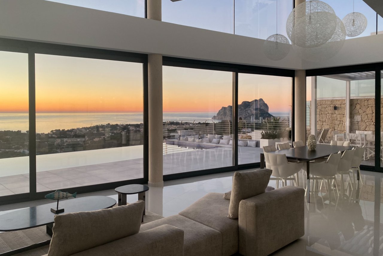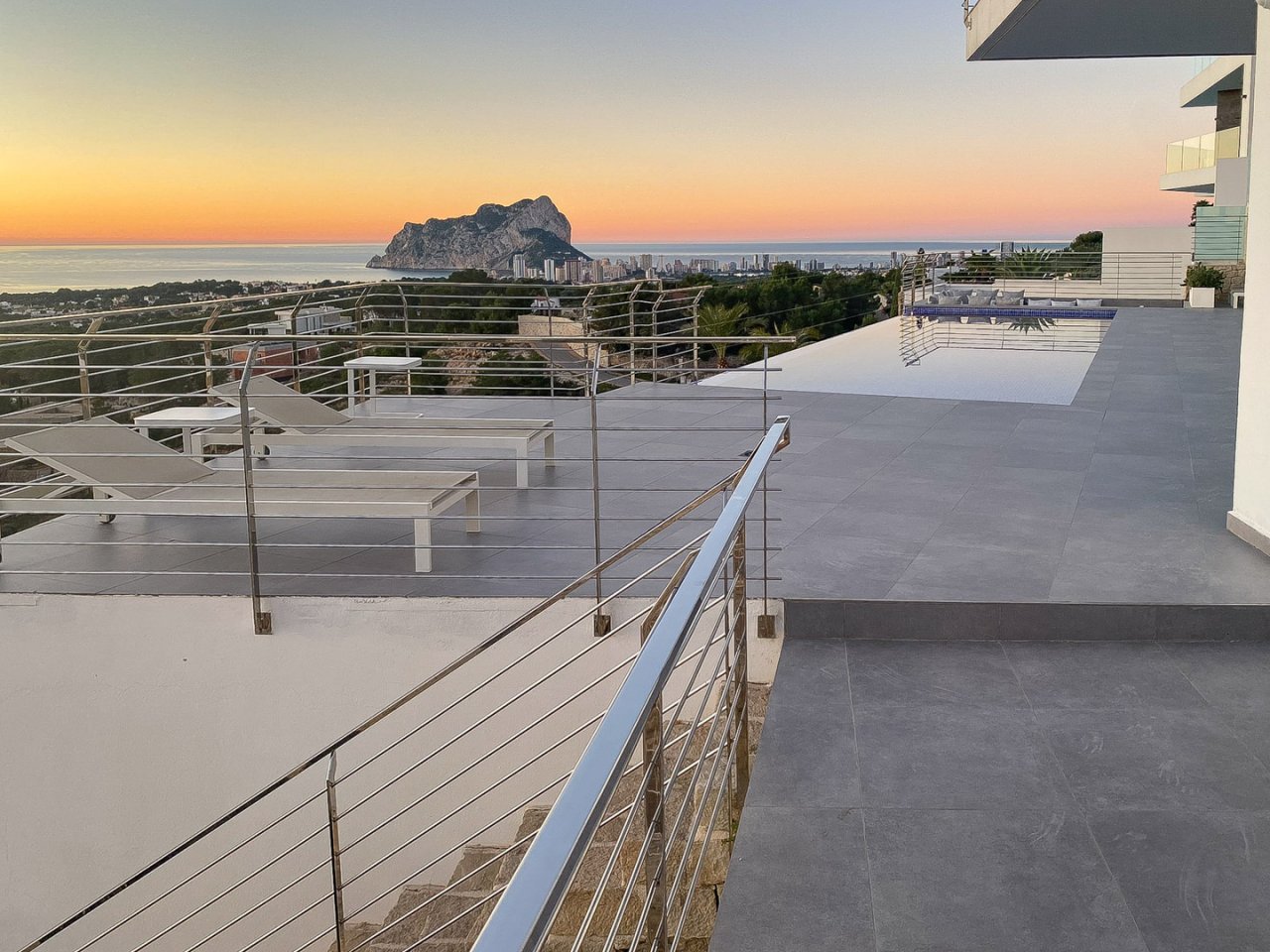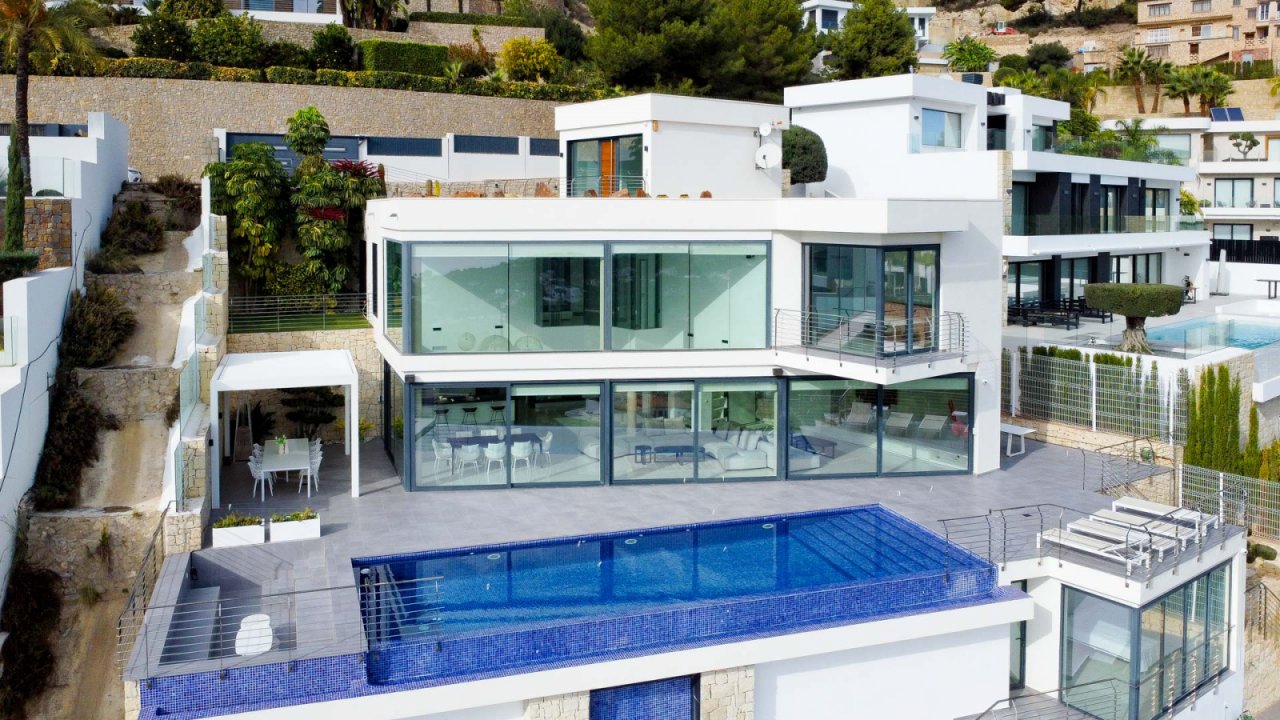 In der prestigeträchtigen Wohngegend Raco de Galeno, nur 1.500 Meter vom Mittelmeer entfernt, steht diese außergewöhnliche Villa, die alles bietet, was Sie sich wünschen können. Mit spektakulärem Meerblick, dem ikonischen Peñón de Ifach und einem unvergleichlichen Design ist dies die Immobilie für diejenigen, die ultimativen Luxus und Komfort suchen. Die Villa erstreckt sich über 3 Etagen, die durch einen Aufzug verbunden sind, auf einem großzügigen Grundstück von 1.800 m². Mit einer bebauten Gesamtfläche von nicht weniger als 770 m² bietet diese Immobilie viel Platz für Entspannung, Unterhaltung und Privatsphäre. Dank des cleveren Grundrisses ist das Anwesen sowohl von oben als auch von unten zugänglich. Oben gibt es einen Parkplatz für drei Fahrzeuge und einen direkten Zugang über einen Aufzug oder eine Treppe zu den unteren Etagen. Im unteren Teil des Grundstücks finden Sie weitere Parkplätze auf verschiedenen Ebenen, so dass Sie auch auf der Ebene des Erdgeschosses parken können. Außerdem gibt es einen Parkplatz für zwei Autos unter einem Vordach. Das Erdgeschoss ist das Herzstück der Villa. Hier finden Sie ein großzügiges Wohnzimmer mit Essbereich und eine moderne, voll ausgestattete offene Küche mit Bar und gekühltem Weinkeller. Die doppelte Decke und die hohen Fenster schaffen ein beeindruckendes Gefühl von Licht und Raum. Für zusätzlichen Komfort stehen eine Waschküche und ein Gäste-WC zur Verfügung. Auf der Ostseite befindet sich eine große Sommerküche, perfekt für das Kochen im Freien und gemütliche Abendessen. Vor dem Wohnzimmer erstreckt sich ein großzügiger Außenbereich mit einem luxuriösen Pool und einer bioklimatischen Pergola, unter der Sie mit bis zu 12 Personen speisen können. Ein eingebauter Sitzbereich neben dem Pool bietet Schutz vor dem Wind und einen unschlagbaren Meerblick. Im Obergeschoss befinden sich drei geräumige Schlafzimmer, jedes mit eigenem Bad en suite. Eines der Zimmer hat eine eigene Terrasse und von allen Zimmern aus genießen Sie einen atemberaubenden Panoramablick auf das Meer. Das Untergeschoss ist ganz dem Wellness und der Entspannung gewidmet. Hier finden Sie einen luxuriösen Fitnessraum, einen großen Innenpool mit Liegebereich, eine Zedernsauna und ein viertes Schlafzimmer mit eigenem Bad und Meerblick. Dieses Schlafzimmer ist sowohl vom Haus als auch vom Garten aus zugänglich, so dass es sich ideal als Gästeunterkunft eignet. Im unteren Teil des Grundstücks befindet sich ein charmantes Gästehaus von 20 m², das für das Personal oder als zusätzliches Gästezimmer genutzt werden kann. Vor dem Cottage befindet sich ein Boccia-Platz, der auf Wunsch in einen Paddle-Platz umgewandelt werden kann. Dank der Süd-Ost-Ausrichtung können Sie auf den verschiedenen Terrassen rund um die Villa den ganzen Tag die Sonne genießen. Raco de Galeno ist eine exklusive Urbanisation, die in den Hügeln von Benissa Costa liegt. In nur wenigen Minuten sind Sie an der wunderschönen Küste von Benissa, die für ihre idyllischen Strände und ihr kristallklares Wasser bekannt ist. Das belebte Zentrum von Calpe mit seinen ausgedehnten Sandstränden und vielen Annehmlichkeiten erreichen Sie in 10 Minuten. Diese Villa in Raco de Galeno ist eine einzigartige Gelegenheit, luxuriös und stilvoll zu wohnen und dabei moderne Architektur, Komfort und eine unschlagbare Lage zu kombinieren.
