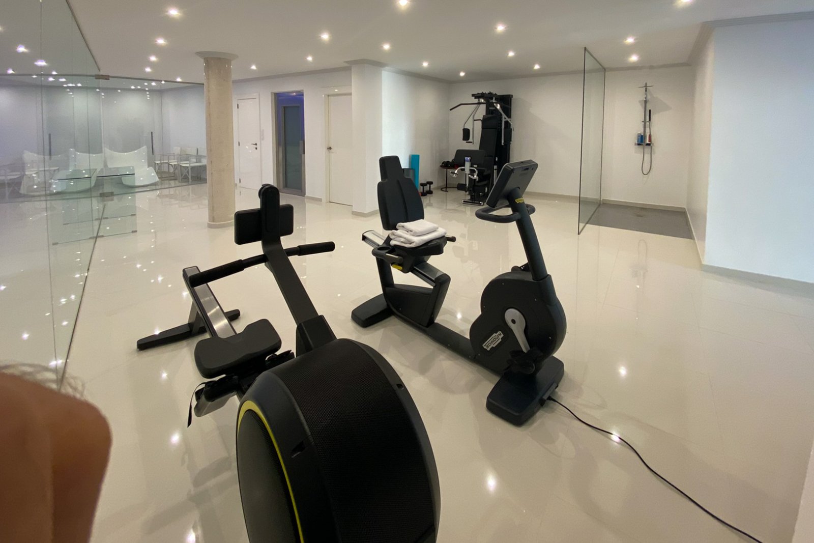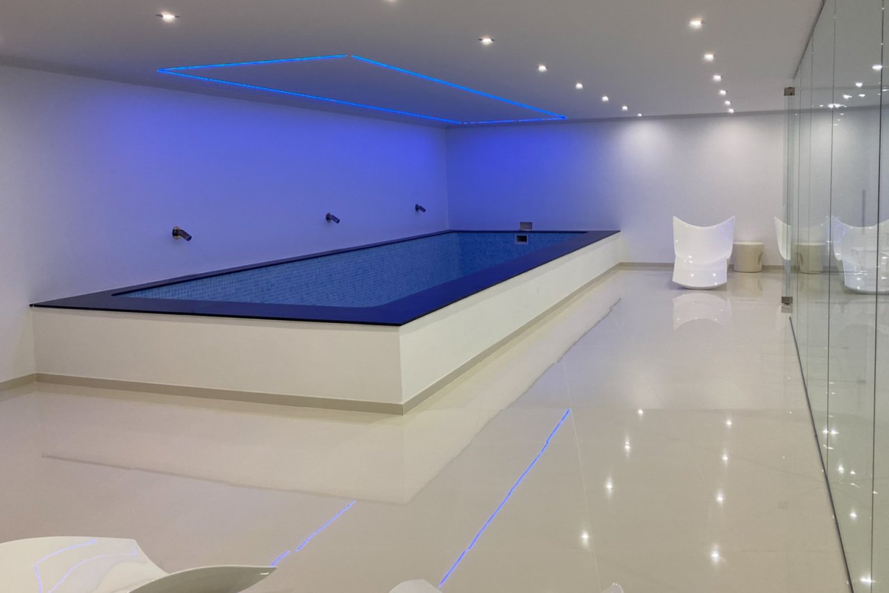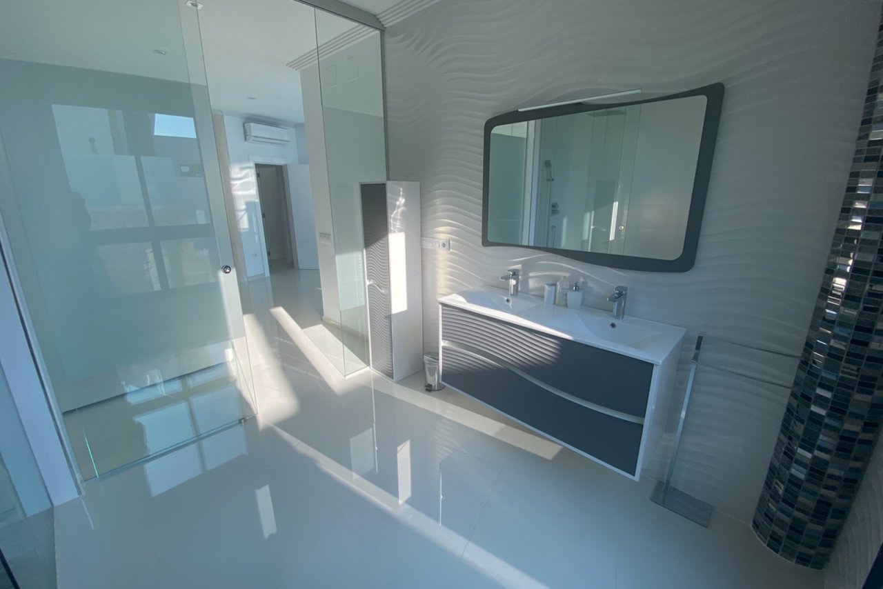 In der prestigeträchtigen Wohngegend Raco de Galeno, nur 1.500 Meter vom Mittelmeer entfernt, steht diese außergewöhnliche Villa, die alles bietet, was Sie sich wünschen können. Mit spektakulärem Meerblick, dem ikonischen Peñón de Ifach und einem unvergleichlichen Design ist dies die Immobilie für diejenigen, die ultimativen Luxus und Komfort suchen. Die Villa erstreckt sich über 3 Etagen, die durch einen Aufzug verbunden sind, auf einem großzügigen Grundstück von 1.800 m². Mit einer bebauten Gesamtfläche von nicht weniger als 770 m² bietet diese Immobilie viel Platz für Entspannung, Unterhaltung und Privatsphäre. Dank des cleveren Grundrisses ist das Anwesen sowohl von oben als auch von unten zugänglich. Oben gibt es einen Parkplatz für drei Fahrzeuge und einen direkten Zugang über einen Aufzug oder eine Treppe zu den unteren Etagen. Im unteren Teil des Grundstücks finden Sie weitere Parkplätze auf verschiedenen Ebenen, so dass Sie auch auf der Ebene des Erdgeschosses parken können. Außerdem gibt es einen Parkplatz für zwei Autos unter einem Vordach. Das Erdgeschoss ist das Herzstück der Villa. Hier finden Sie ein großzügiges Wohnzimmer mit Essbereich und eine moderne, voll ausgestattete offene Küche mit Bar und gekühltem Weinkeller. Die doppelte Decke und die hohen Fenster schaffen ein beeindruckendes Gefühl von Licht und Raum. Für zusätzlichen Komfort stehen eine Waschküche und ein Gäste-WC zur Verfügung. Auf der Ostseite befindet sich eine große Sommerküche, perfekt für das Kochen im Freien und gemütliche Abendessen. Vor dem Wohnzimmer erstreckt sich ein großzügiger Außenbereich mit einem luxuriösen Pool und einer bioklimatischen Pergola, unter der Sie mit bis zu 12 Personen speisen können. Ein eingebauter Sitzbereich neben dem Pool bietet Schutz vor dem Wind und einen unschlagbaren Meerblick. Im Obergeschoss befinden sich drei geräumige Schlafzimmer, jedes mit eigenem Bad en suite. Eines der Zimmer hat eine eigene Terrasse und von allen Zimmern aus genießen Sie einen atemberaubenden Panoramablick auf das Meer. Das Untergeschoss ist ganz dem Wellness und der Entspannung gewidmet. Hier finden Sie einen luxuriösen Fitnessraum, einen großen Innenpool mit Liegebereich, eine Zedernsauna und ein viertes Schlafzimmer mit eigenem Bad und Meerblick. Dieses Schlafzimmer ist sowohl vom Haus als auch vom Garten aus zugänglich, so dass es sich ideal als Gästeunterkunft eignet. Im unteren Teil des Grundstücks befindet sich ein charmantes Gästehaus von 20 m², das für das Personal oder als zusätzliches Gästezimmer genutzt werden kann. Vor dem Cottage befindet sich ein Boccia-Platz, der auf Wunsch in einen Paddle-Platz umgewandelt werden kann. Dank der Süd-Ost-Ausrichtung können Sie auf den verschiedenen Terrassen rund um die Villa den ganzen Tag die Sonne genießen. Raco de Galeno ist eine exklusive Urbanisation, die in den Hügeln von Benissa Costa liegt. In nur wenigen Minuten sind Sie an der wunderschönen Küste von Benissa, die für ihre idyllischen Strände und ihr kristallklares Wasser bekannt ist. Das belebte Zentrum von Calpe mit seinen ausgedehnten Sandstränden und vielen Annehmlichkeiten erreichen Sie in 10 Minuten. Diese Villa in Raco de Galeno ist eine einzigartige Gelegenheit, luxuriös und stilvoll zu wohnen und dabei moderne Architektur, Komfort und eine unschlagbare Lage zu kombinieren.