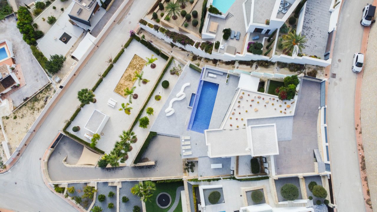 In der prestigeträchtigen Wohngegend Raco de Galeno, nur 1.500 Meter vom Mittelmeer entfernt, steht diese außergewöhnliche Villa, die alles bietet, was Sie sich wünschen können. Mit spektakulärem Meerblick, dem ikonischen Peñón de Ifach und einem unvergleichlichen Design ist dies die Immobilie für diejenigen, die ultimativen Luxus und Komfort suchen. Die Villa erstreckt sich über 3 Etagen, die durch einen Aufzug verbunden sind, auf einem großzügigen Grundstück von 1.800 m². Mit einer bebauten Gesamtfläche von nicht weniger als 770 m² bietet diese Immobilie viel Platz für Entspannung, Unterhaltung und Privatsphäre. Dank des cleveren Grundrisses ist das Anwesen sowohl von oben als auch von unten zugänglich. Oben gibt es einen Parkplatz für drei Fahrzeuge und einen direkten Zugang über einen Aufzug oder eine Treppe zu den unteren Etagen. Im unteren Teil des Grundstücks finden Sie weitere Parkplätze auf verschiedenen Ebenen, so dass Sie auch auf der Ebene des Erdgeschosses parken können. Außerdem gibt es einen Parkplatz für zwei Autos unter einem Vordach. Das Erdgeschoss ist das Herzstück der Villa. Hier finden Sie ein großzügiges Wohnzimmer mit Essbereich und eine moderne, voll ausgestattete offene Küche mit Bar und gekühltem Weinkeller. Die doppelte Decke und die hohen Fenster schaffen ein beeindruckendes Gefühl von Licht und Raum. Für zusätzlichen Komfort stehen eine Waschküche und ein Gäste-WC zur Verfügung. Auf der Ostseite befindet sich eine große Sommerküche, perfekt für das Kochen im Freien und gemütliche Abendessen. Vor dem Wohnzimmer erstreckt sich ein großzügiger Außenbereich mit einem luxuriösen Pool und einer bioklimatischen Pergola, unter der Sie mit bis zu 12 Personen speisen können. Ein eingebauter Sitzbereich neben dem Pool bietet Schutz vor dem Wind und einen unschlagbaren Meerblick. Im Obergeschoss befinden sich drei geräumige Schlafzimmer, jedes mit eigenem Bad en suite. Eines der Zimmer hat eine eigene Terrasse und von allen Zimmern aus genießen Sie einen atemberaubenden Panoramablick auf das Meer. Das Untergeschoss ist ganz dem Wellness und der Entspannung gewidmet. Hier finden Sie einen luxuriösen Fitnessraum, einen großen Innenpool mit Liegebereich, eine Zedernsauna und ein viertes Schlafzimmer mit eigenem Bad und Meerblick. Dieses Schlafzimmer ist sowohl vom Haus als auch vom Garten aus zugänglich, so dass es sich ideal als Gästeunterkunft eignet. Im unteren Teil des Grundstücks befindet sich ein charmantes Gästehaus von 20 m², das für das Personal oder als zusätzliches Gästezimmer genutzt werden kann. Vor dem Cottage befindet sich ein Boccia-Platz, der auf Wunsch in einen Paddle-Platz umgewandelt werden kann. Dank der Süd-Ost-Ausrichtung können Sie auf den verschiedenen Terrassen rund um die Villa den ganzen Tag die Sonne genießen. Raco de Galeno ist eine exklusive Urbanisation, die in den Hügeln von Benissa Costa liegt. In nur wenigen Minuten sind Sie an der wunderschönen Küste von Benissa, die für ihre idyllischen Strände und ihr kristallklares Wasser bekannt ist. Das belebte Zentrum von Calpe mit seinen ausgedehnten Sandstränden und vielen Annehmlichkeiten erreichen Sie in 10 Minuten. Diese Villa in Raco de Galeno ist eine einzigartige Gelegenheit, luxuriös und stilvoll zu wohnen und dabei moderne Architektur, Komfort und eine unschlagbare Lage zu kombinieren.