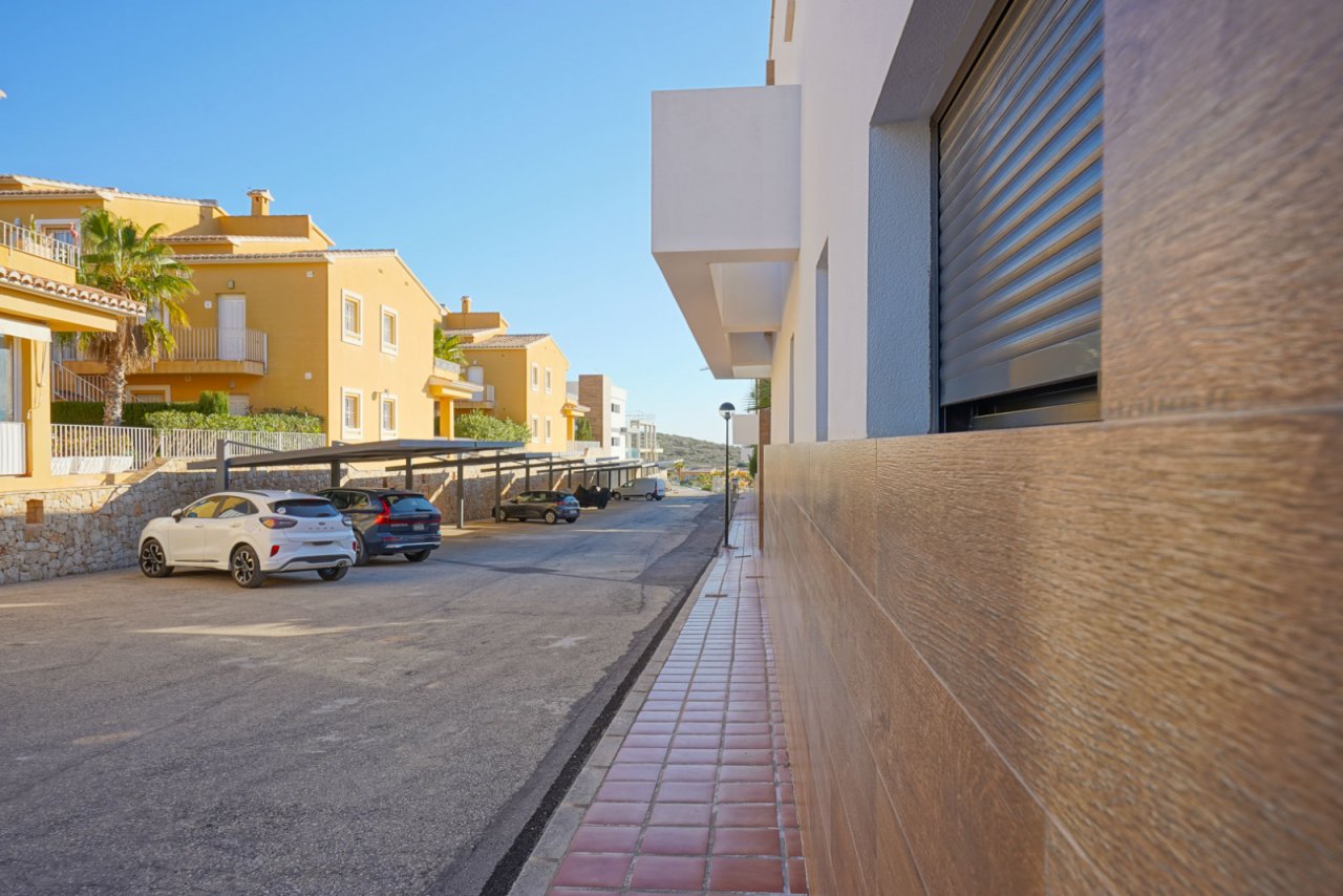 Für zusätzlichen Komfort verfügt die Wohnung über zwei weitere Einbauschränke, einen großen im Wohnzimmer und einen kleineren im Eingangsbereich. Draußen gibt es eine geräumige überdachte Terrasse mit einer Lounge und einem Essbereich. Vor der Terrasse liegt ein schöner Garten mit freiem Blick auf das weitläufige Naturschutzgebiet, das Cumbre del Sol von Moraira trennt. Dank der Natursteinmauer an der Ostseite ist Ihre Privatsphäre hier garantiert.