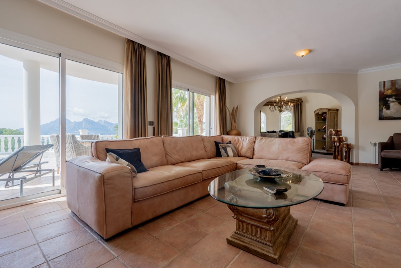 Durch ein automatisches Tor gelangt man auf das Grundstück, wobei sich die Einfahrt sofort in zwei Teile teilt, so dass man die Wahl hat, ob man am Eingang des Haupthauses oder am Eingang des Gästehauses parkt. Wenn Sie am Haupthaus parken, führt eine Treppe zur Eingangstür. Sie betreten eine stilvolle Diele mit einer geräumigen, voll ausgestatteten Küche auf der rechten Seite. Die Diele geht in das Wohn-Esszimmer über, in dem sich auch ein kleines Büro befindet. Durch einen Korridor, in dem sich ein weiteres Badezimmer befindet, erreicht man das Hauptschlafzimmer mit begehbarem Kleiderschrank und eigenem Bad. Von allen Zimmern (außer den Bädern) hat man einen schönen Blick auf die Landschaft. Sowohl vom Wohnzimmer als auch vom Schlafzimmer aus hat man über Schiebefenster direkten Zugang zur Terrasse am Pool. Auf dieser Etage gibt es auch eine überdachte Terrasse, eine Außenküche mit Bar und eine Außendusche. Das Gästehaus besteht aus einer Küche, einer Essecke, von der aus man ebenfalls die schöne Aussicht auf die Sierra de Bernia genießen kann, einem Wohnzimmer, einem Schlafzimmer mit eigenem Bad und zwei Schlafzimmern, die sich ein Bad teilen. Gegenüber dem Gästehaus befindet sich ein großer Raum von ca. 44 m2 mit mehreren Fenstern, der sich ideal in ein zusätzliches Schlafzimmer, einen Fitnessraum oder ein gemütliches Studio verwandeln lässt. Das Gästehaus und das Studio teilen sich eine private Terrasse. Die Villa verfügt über Klimaanlage in allen Räumen, Zentralheizung über Heizkörper, Rollläden und Einbauschränke. Außerdem gibt es eine Kameraüberwachung, die aus mehreren Kameras und einer Alarmanlage besteht. Die Villa ist von einem pflegeleichten Garten umgeben, der mit einer automatischen Bewässerung ausgestattet ist. Außerdem gibt es eine Garage.
