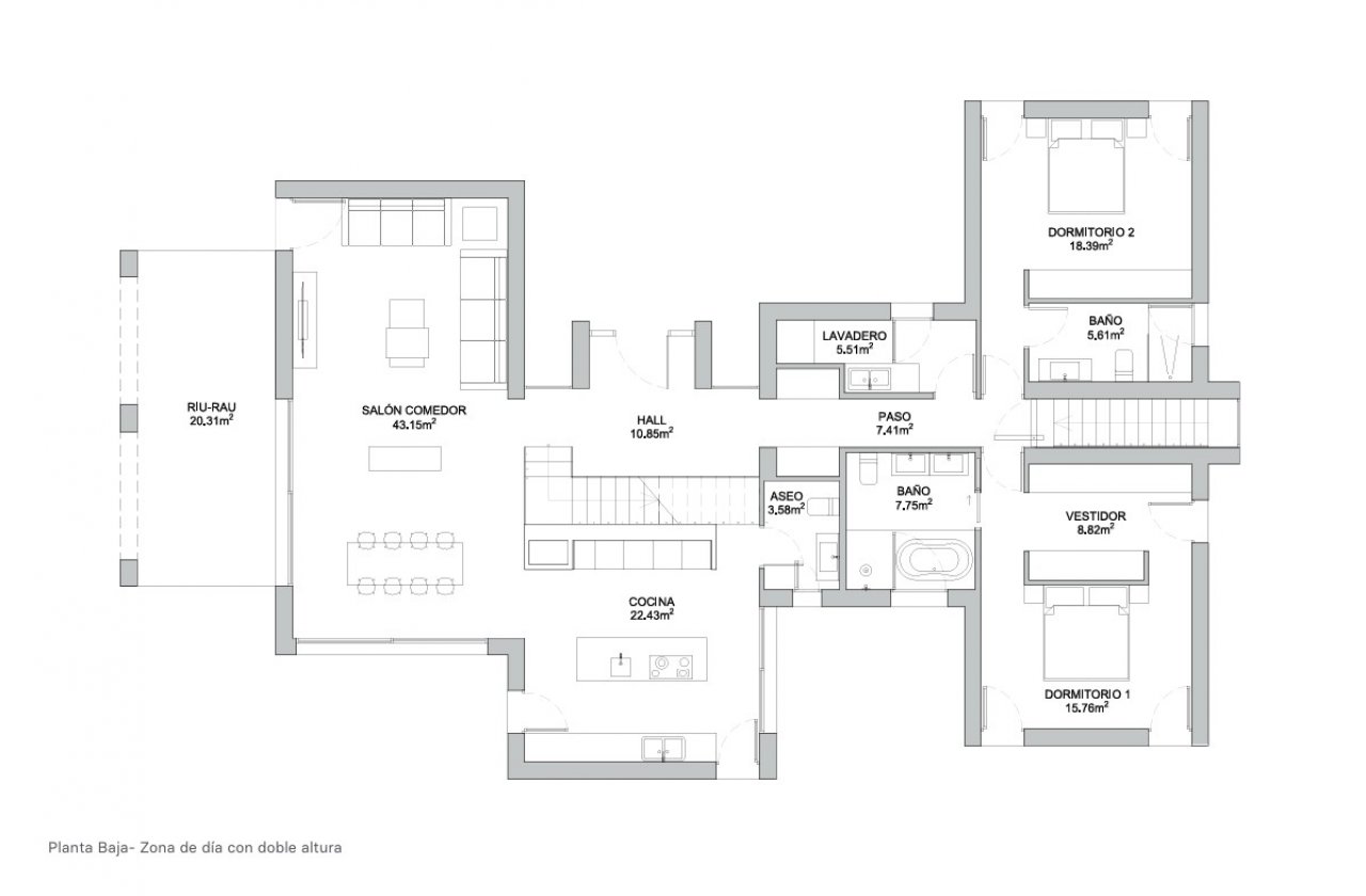Vom Wohnzimmer aus gelangt man durch Schiebefenster auf das „riu rau“, eine große überdachte Terrasse mit Blick auf den Garten und den Pool. Am Pool befindet sich ein überdachter Essbereich mit einer Küche, ideal um den ganzen Sommer am Pool zu verbringen. Die Villa ist umgeben von einem mediterranen Garten mit automatischer Bewässerung und mehreren Terrassen. Es gibt eine Auffahrt mit Parkplätzen für mehrere Autos. Eine Vorinstallation für eine Poolheizung wird installiert und eine Vorinstallation für eine Alarmanlage. Als Klimaanlage wird das System AEROTHERMIA zum Heizen und Kühlen sowie eine Fußbodenheizung im gesamten Haus mit AIRZONE-System installiert.