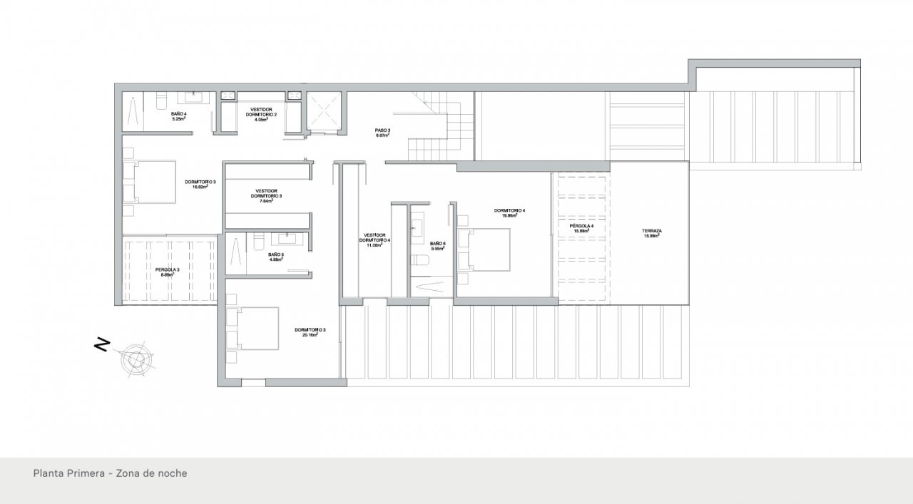 Die Villa hat eine Gesamtfläche von 459 m2, die sich auf zwei Etagen und ein Untergeschoss mit einer Doppelgarage verteilt. Im Erdgeschoss befinden sich ein geräumiges Wohn-Esszimmer mit moderner, offener Küche, ein Schlafzimmer mit eigenem Bad und privater Terrasse sowie ein Gäste-WC. Im Obergeschoss befinden sich drei weitere luxuriöse Schlafzimmer, jedes mit eigenem Bad und Ankleidezimmer. Ein Schlafzimmer hat durch Schiebefenster Zugang zu einer privaten Terrasse und die beiden anderen Schlafzimmer teilen sich eine sehr große Terrasse. Im Untergeschoss befinden sich eine Garage mit Stellplatz für zwei Autos, eine Eingangshalle und ein Gäste-WC. Im Außenbereich befindet sich ein Swimmingpool, der von mehreren überdachten und nicht überdachten Terrassen umgeben ist. Die Villa verfügt über eine großzügige Auffahrt mit Zugang zur Garage. Eine Vorinstallation für eine Poolheizung und eine Vorinstallation für eine Alarmanlage werden installiert. Als Klimaanlage wird das System AEROTHERMIA zum Heizen und Kühlen sowie eine Fußbodenheizung im gesamten Haus mit AIRZONE-System installiert.