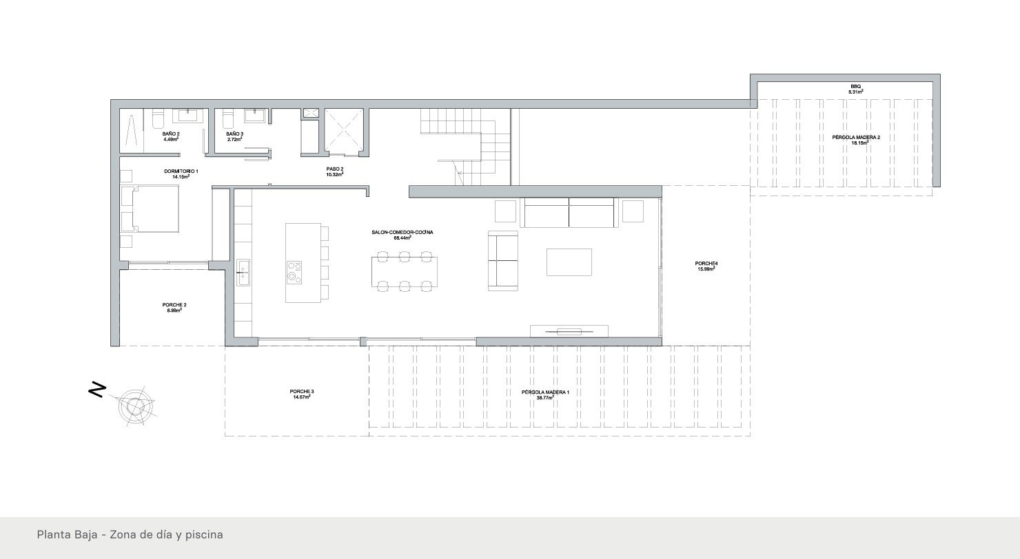 Die Villa hat eine Gesamtfläche von 459 m2, die sich auf zwei Etagen und ein Untergeschoss mit einer Doppelgarage verteilt. Im Erdgeschoss befinden sich ein geräumiges Wohn-Esszimmer mit moderner, offener Küche, ein Schlafzimmer mit eigenem Bad und privater Terrasse sowie ein Gäste-WC. Im Obergeschoss befinden sich drei weitere luxuriöse Schlafzimmer, jedes mit eigenem Bad und Ankleidezimmer. Ein Schlafzimmer hat durch Schiebefenster Zugang zu einer privaten Terrasse und die beiden anderen Schlafzimmer teilen sich eine sehr große Terrasse. Im Untergeschoss befinden sich eine Garage mit Stellplatz für zwei Autos, eine Eingangshalle und ein Gäste-WC. Im Außenbereich befindet sich ein Swimmingpool, der von mehreren überdachten und nicht überdachten Terrassen umgeben ist. Die Villa verfügt über eine großzügige Auffahrt mit Zugang zur Garage. Eine Vorinstallation für eine Poolheizung und eine Vorinstallation für eine Alarmanlage werden installiert. Als Klimaanlage wird das System AEROTHERMIA zum Heizen und Kühlen sowie eine Fußbodenheizung im gesamten Haus mit AIRZONE-System installiert.