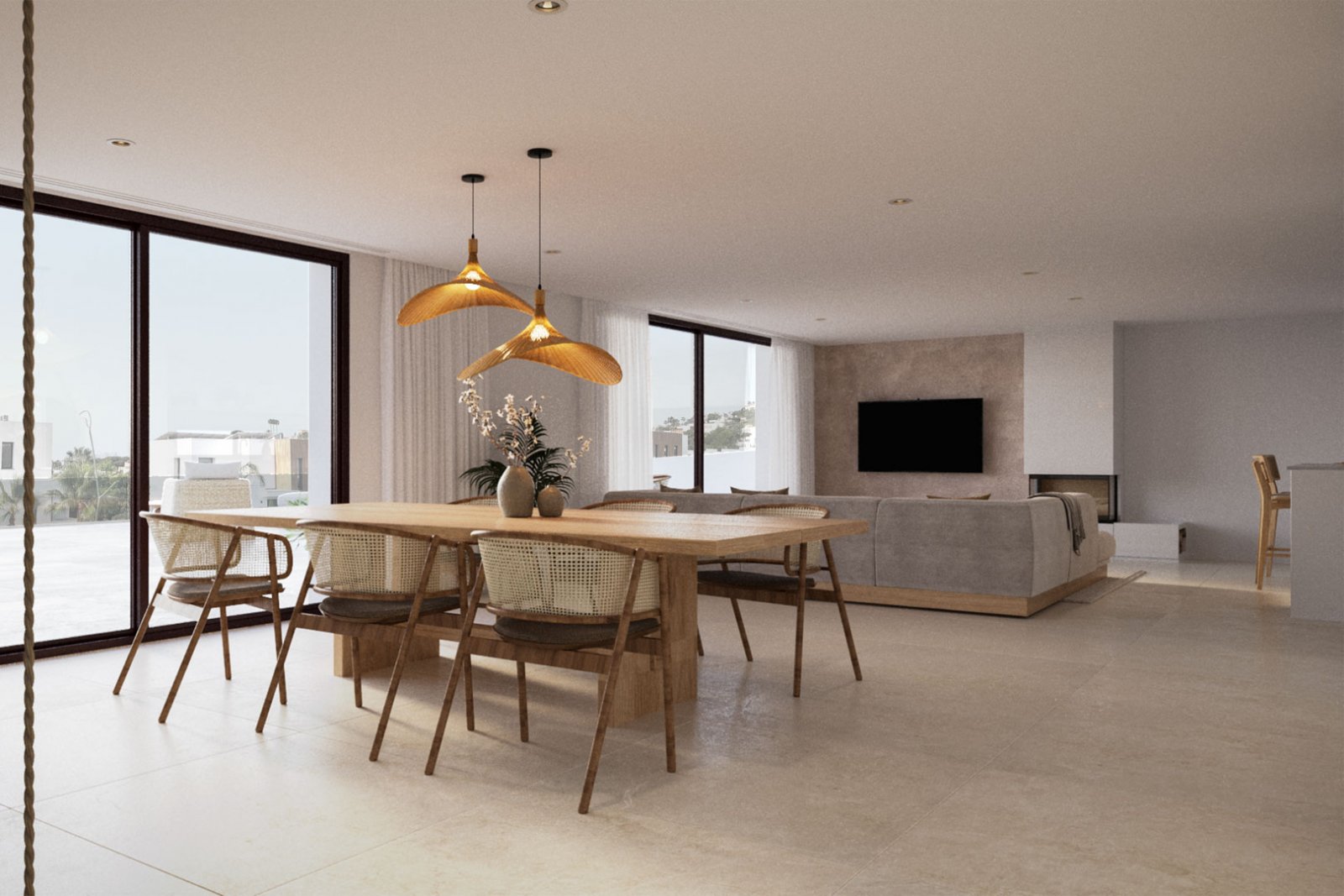 Das Herzstück des Hauses bildet ein heller Wohnbereich mit hohen Decken, der ein geräumiges Wohnzimmer und eine Designerküche mit zentraler Kochinsel und hochwertigen Geräten umfasst. Von hier aus öffnen sich große Fenster zur Hauptterrasse und ermöglichen den Genuss der Aussicht nach draußen.