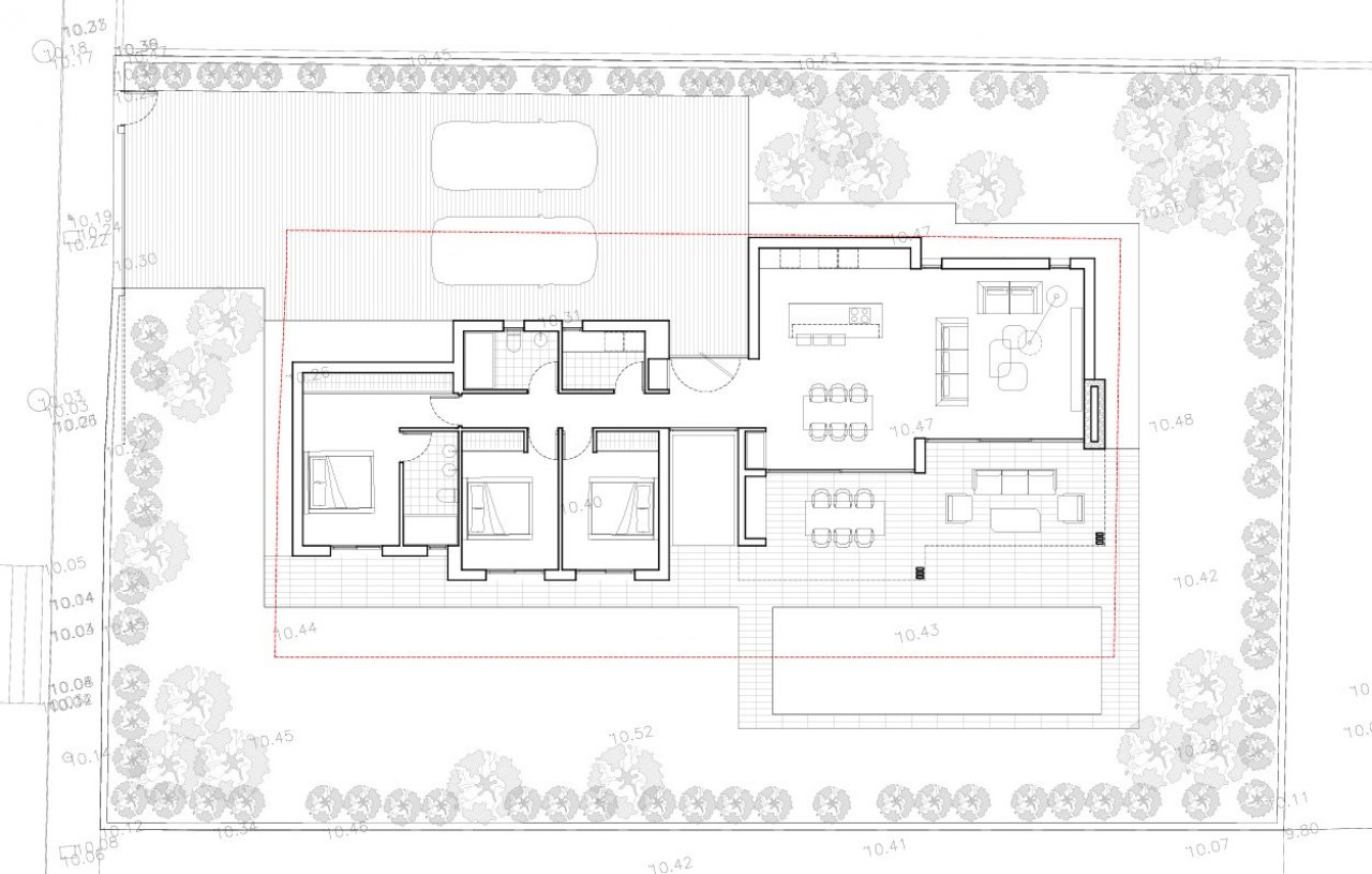 Diese ebenerdige Villa wurde für komfortables, bequemes Wohnen und einen nahtlosen Übergang zwischen Innen- und Außenbereich konzipiert. Mit einer Gesamtwohnfläche von 139,61 m2 verfügt das Haus über ein geräumiges Wohn-Esszimmer mit offener Küche, drei Doppelschlafzimmer und zwei Badezimmer (eines davon en-suite im Hauptschlafzimmer). Die großen Fenster und der direkte Zugang zur Terrasse sorgen für viel Tageslicht.