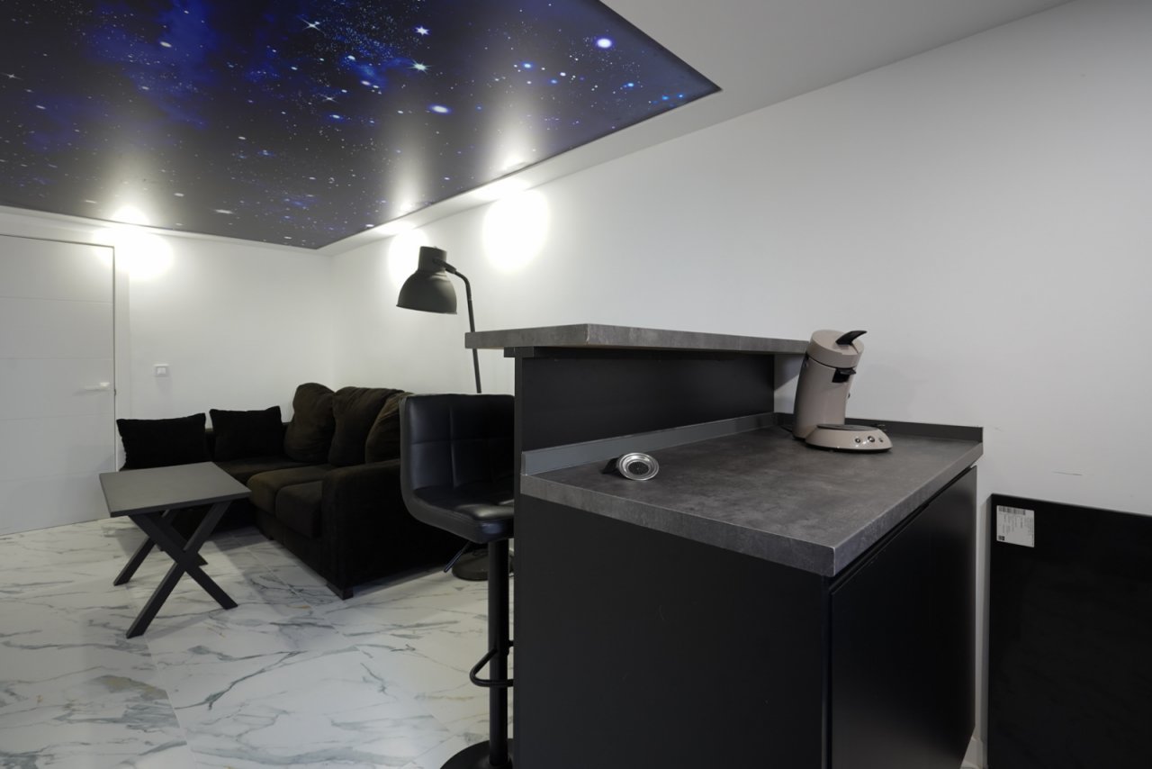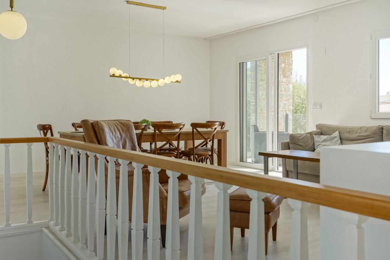 Das Erdgeschoss bildet eine völlig unabhängige Gästeunterkunft mit einem Wohnzimmer, einer offenen Küche, drei Schlafzimmern und einem Badezimmer. Perfekt für Familie, Freunde oder als Vermietungsmöglichkeit. Die Gästeunterkunft ist sowohl intern mit dem Haus verbunden als auch über einen privaten Eingang zugänglich. Zwei der drei Schlafzimmer bieten direkten Zugang zur Terrasse am Pool.