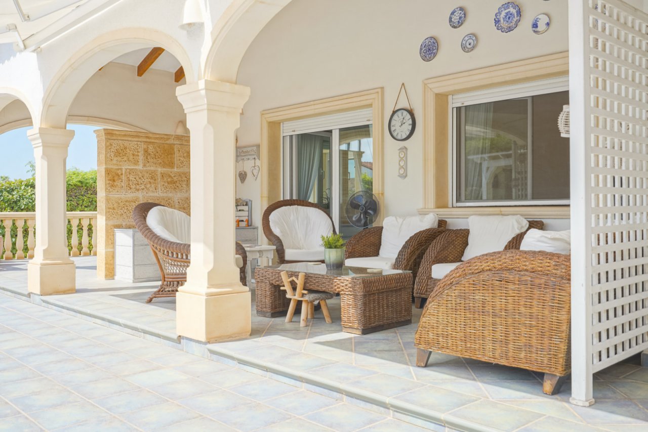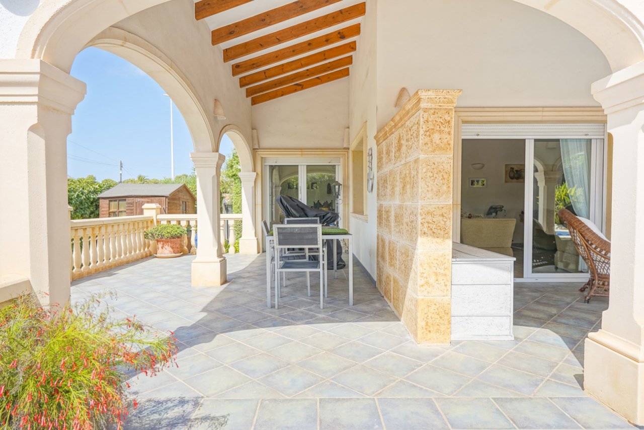 Über einige Stufen gelangt man zur Veranda an der Eingangstür und betritt eine geräumige Diele. Von der Diele aus gelangt man in die geräumige, offene Küche mit angrenzendem Essbereich. Neben dem Essbereich befindet sich ein geräumiges Wohnzimmer mit Kamin. Darüber hinaus verfügt die Villa über ein Hauptschlafzimmer mit eigenem Bad und zwei Schlafzimmer mit einem gemeinsamen Bad. Alle Schlafzimmer sind mit Einbauschränken, Rollläden und Klimaanlage ausgestattet. Darüber hinaus verfügt die Villa über Fußbodenheizung und einen Kamin. Im Außenbereich gibt es eine großzügige überdachte Terrasse sowohl auf der Süd- als auch auf der Westseite der Villa. Außerdem gibt es einen großen Swimmingpool und eine Außenküche. Die Villa ist von einem ausgewachsenen mediterranen Garten umgeben und verfügt über mehrere Parkplätze, einen Carport und einen Abstellraum.