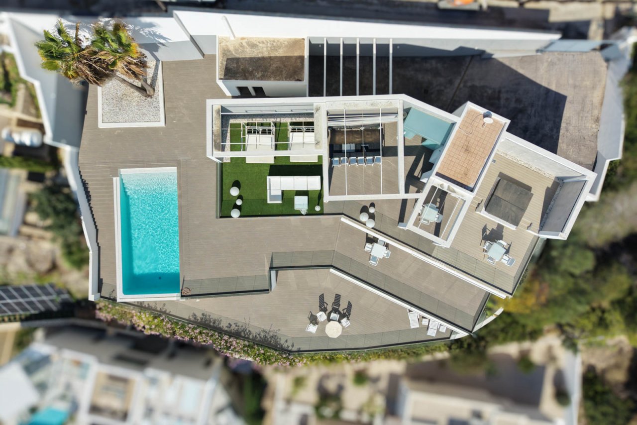 Diese exklusive Villa im modernen Stil steht auf einem über 900 m² großen Grundstück und ist nach Süden ausgerichtet, sodass Sie ganztägig Sonnenschein und einen atemberaubenden Blick auf das Mittelmeer genießen können. Mit über 400 m² Wohnfläche und 480 m² Terrassen vereint das Anwesen perfekt modernes Design, Komfort und Eleganz.