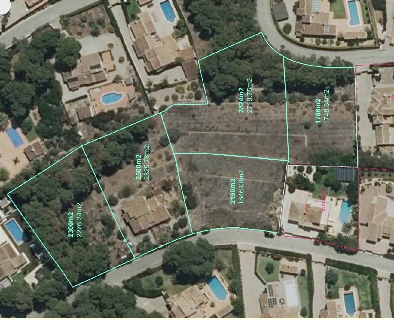 Auf einem der Grundstücke steht derzeit eine 297 m2 große Villa, die sich über zwei Etagen erstreckt. Es besteht die Möglichkeit, ein weiteres Baugrundstück zu schaffen, indem die drei südlichen Grundstücke in vier Grundstücke aufgeteilt werden.