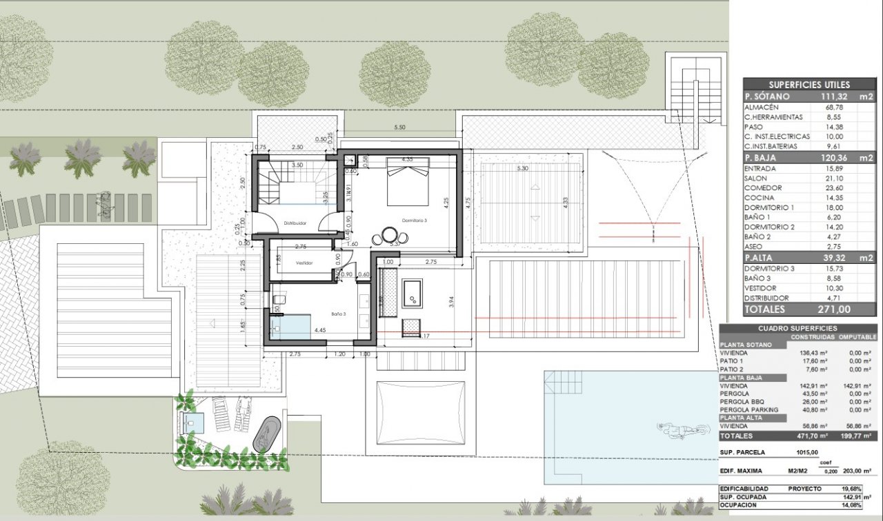Im Außenbereich befindet sich ein wunderschöner 13 × 5 Meter großer Salzwasserpool im Bali-Stil, mit Liegebereich und Vorinstallation für eine Heizungsanlage. Die umlaufende 212 m2 große Terrasse ist mit zwei Pergolen aus Iroko-Holz ausgestattet, und dank der Südausrichtung genießen Sie hier ganzjährig Sonne.