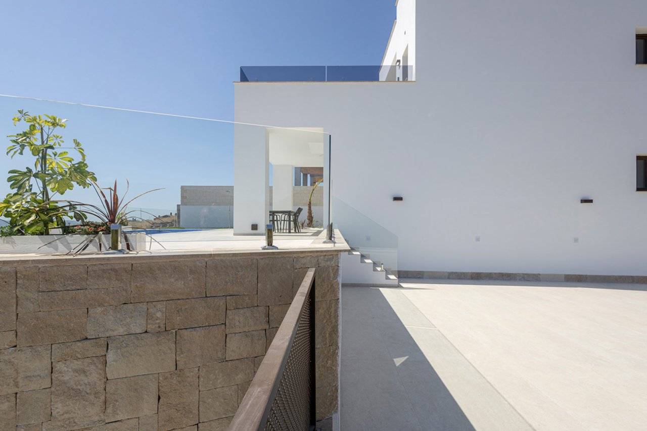 In ruhiger, erhöhter Lage vereint dieses Haus modernes Design, viel Tageslicht und eine harmonische Einbettung in die Landschaft. Das Anwesen erstreckt sich über zwei Etagen. Im Erdgeschoss befinden sich ein großzügiger und heller offener Wohn- und Essbereich mit Küche – funktional und einladend gestaltet – sowie ein Schlafzimmer, ein Badezimmer und ein Gäste-WC. Im Obergeschoss befinden sich zwei Schlafzimmer mit jeweils eigenem Bad und Zugang zu zwei Terrassen mit unverbaubarem Ausblick. Optional kann gegen Aufpreis ein drittes Stockwerk mit Solarium errichtet werden – ideal zum Entspannen oder um das mediterrane Klima ganzjährig zu genießen. Zur Villa gehören pflegeleichte Gärten, ein 7 x 3 m großer privater Swimmingpool mit Außendusche und ein Stellplatz auf dem Grundstück. Ein Haus, das Komfort, Privatsphäre und atemberaubende Aussicht bietet – perfekt als Hauptwohnsitz oder Kapitalanlage. Bitte erfragen Sie Verfügbarkeit und Preis.