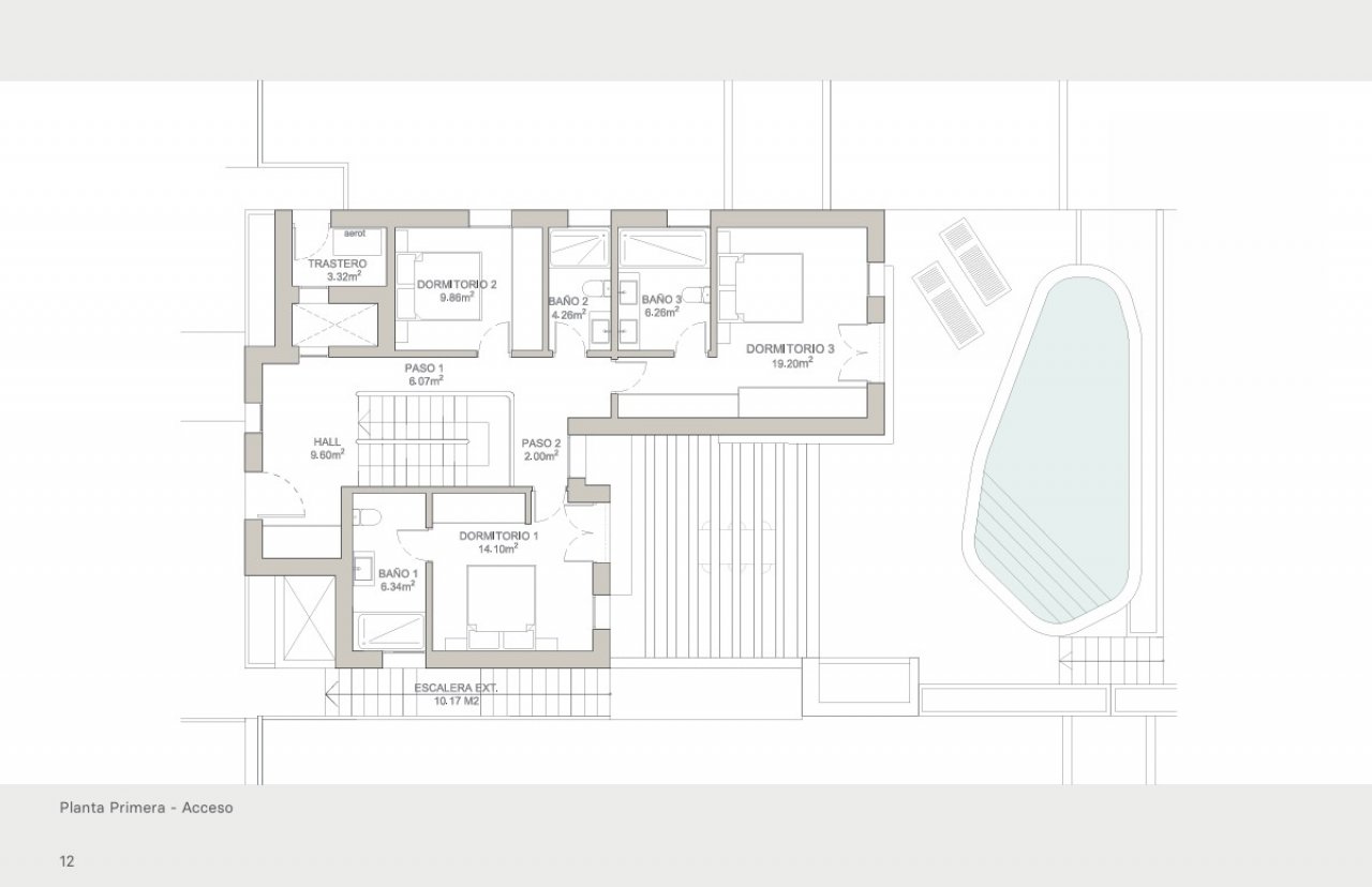 Sie betreten das Obergeschoss durch eine geräumige Eingangshalle. Auf dieser Etage befinden sich drei geräumige Doppelschlafzimmer, jedes mit einem eigenen Bad. Im Erdgeschoss befindet sich der Wohnbereich, bestehend aus einem geräumigen Wohn-Esszimmer mit einer offenen Küche mit Kochinsel und einer Waschküche. Für zusätzlichen Komfort gibt es auf dieser Etage ein viertes Schlafzimmer mit eigenem Bad. Sowohl vom Wohnzimmer als auch vom Schlafzimmer aus haben Sie direkten Zugang zur Terrasse am Pool, die auch über einen Grillbereich verfügt. Darüber hinaus verfügt die Villa über ein voll ausgestattetes Außenbadezimmer, einen Abstellraum und einen Parkplatz für zwei Autos. Für optimalen Komfort sind sowohl eine Klimaanlage (warm/kalt) als auch eine Fußbodenheizung installiert, die über das AIRZONE-System gesteuert werden können.