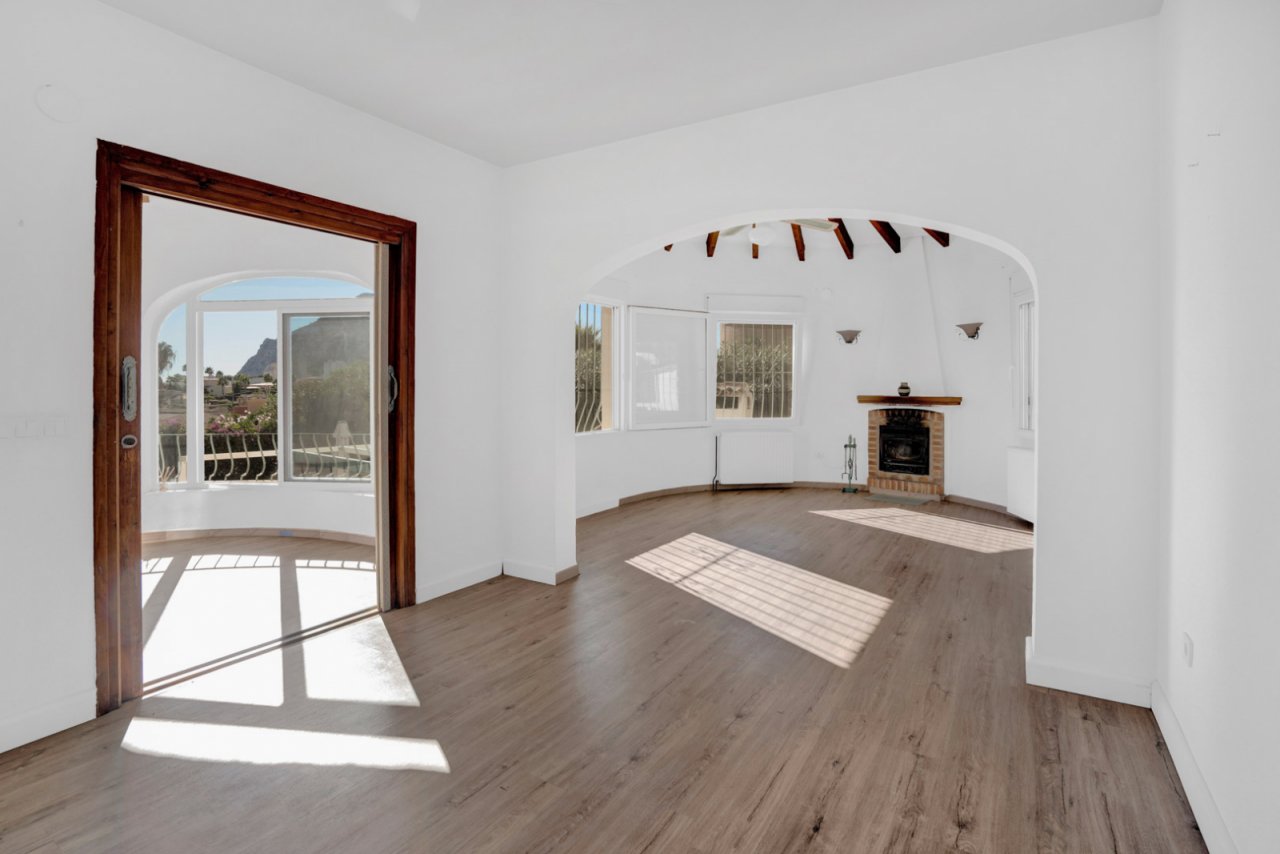 Über eine Treppe gelangt man in die Villa, die zu einer verglasten Terrasse führt. Sie verfügt über ein helles Wohn-Esszimmer mit großen Fenstern und freiem Blick auf den markanten Peñón de Ifach, eine Küche, Schlafzimmer mit Einbauschränken und ein Badezimmer. Zentralheizung und Klimaanlage sind vorhanden.