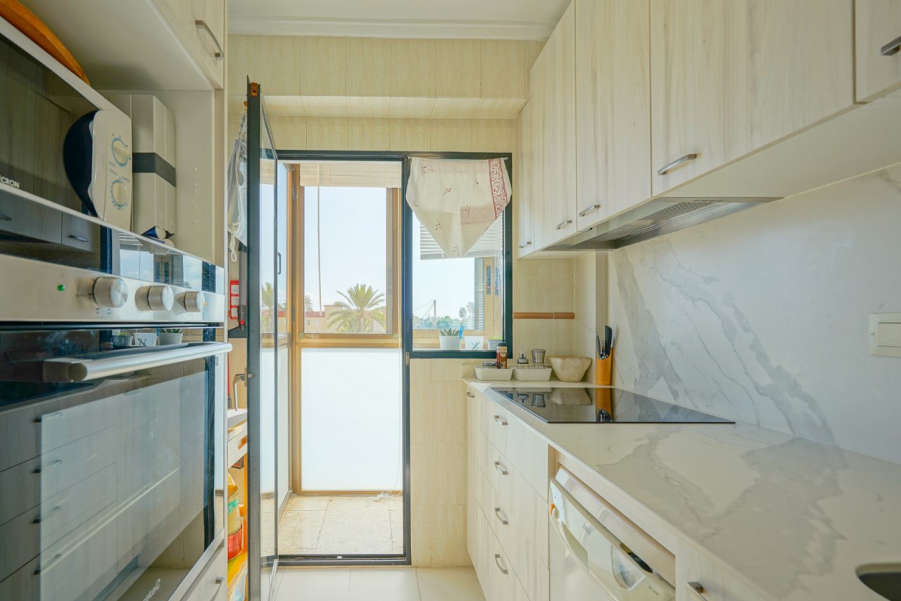 Die Wohnung verfügt über zwei Schlafzimmer, beide mit Einbauschränken. Das Hauptschlafzimmer hat Meerblick. Das Badezimmer wurde 2008 renoviert und 2020 wurde ein neuer Bodenbelag verlegt. Für optimalen Komfort ist die Wohnung mit einer Klimaanlage (warm/kalt), Rollläden, Doppelverglasung und einem Privatparkplatz ausgestattet.